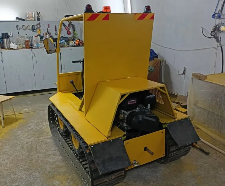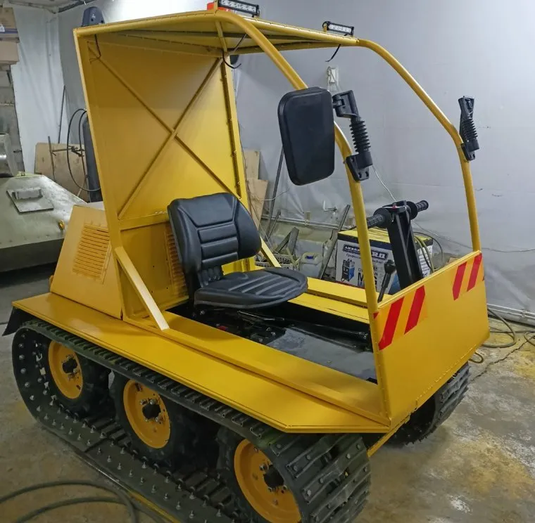 Навесное оборудование может быть любым. Первая модель предусматривает фронтальный бульдозерный отвал. В будущем появится модель с щеткой и задним плугом. Гусеницы позволяют перемещаться по сугробам. Мощности машины хватит, чтобы тянуть за собой внедорожник. Вес спецтехники составляет 400 кг. Конструкция в основном состоит из отечественных запчастей. Из иностранных в механизме только двигатель и фары.
