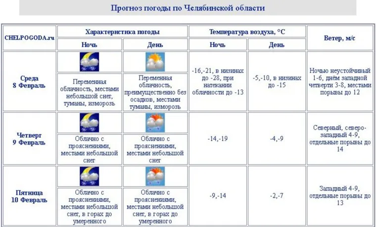 В столице Южного Урала ночь будет не столько морозной: минус 19-21 градус. Следующие двое суток на фоне облачной погоды и снегопадов в регионе установится обычная февральская погода: от 9 до 19 градусов мороза ночью и 2-9 градуса днем. При осадках возможны метели из-за довольно сильного ветра — до 14 метров в секунду.