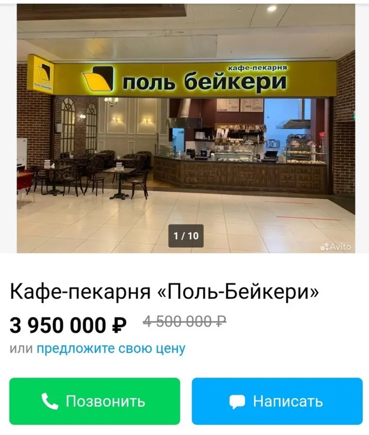 «Вашему вниманию к продаже предлагается действующее кафе-пекарня „Поль-Бейкери“. Продается срочно, цена 3 миллиона 950 тысяч рублей», — указано в объявлении на платформе Avito.