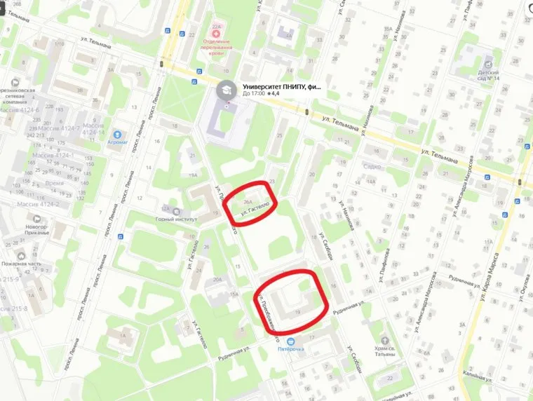 Оба здания, в которых появились трещины (обведены красным цветом) находятся всего в нескольких метрах от филиала Пермского Политеха