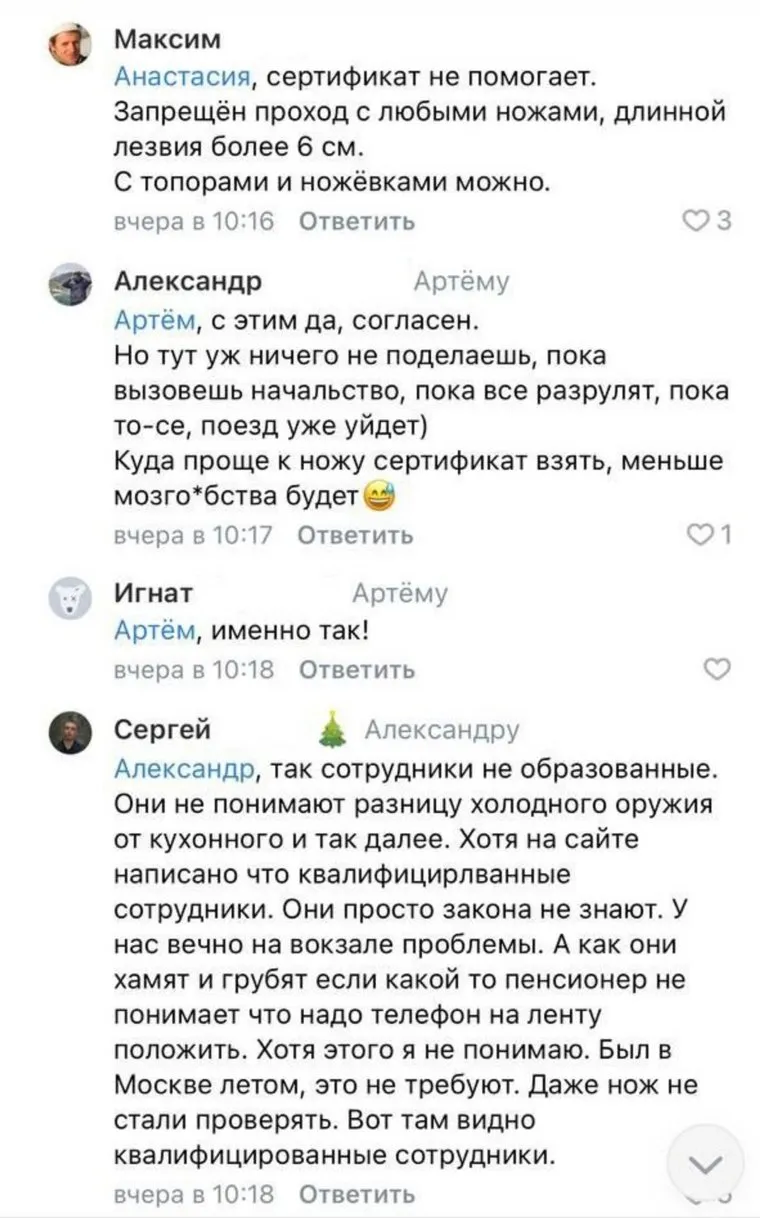 Подписчики возмутились таким нововведениям со стороны администрации вокзала. «Сотрудники необразованные, они не понимают разницу между холодным оружием и кухонным ножом. У нас вечно проблемы на вокзале из-за этого, они просто не знают закона», — рассказал Сергей Быков на странице «Ураловед» в соцсети «ВКонтакте».