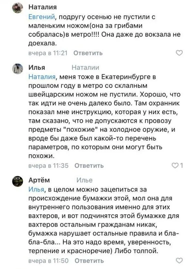 Некоторые участники группы рекомендовали брать с собой сертификаты, которые выдают при покупке ножа хозяйственно-бытового применения. «Нас не пропустили со складным ножом, сотрудник требовал доказать что нож не является холодным оружием. Сертификат на нож может помочь, но это не точно», — прокомментировала Анастасия Бехтерева в группе «Ураловед».