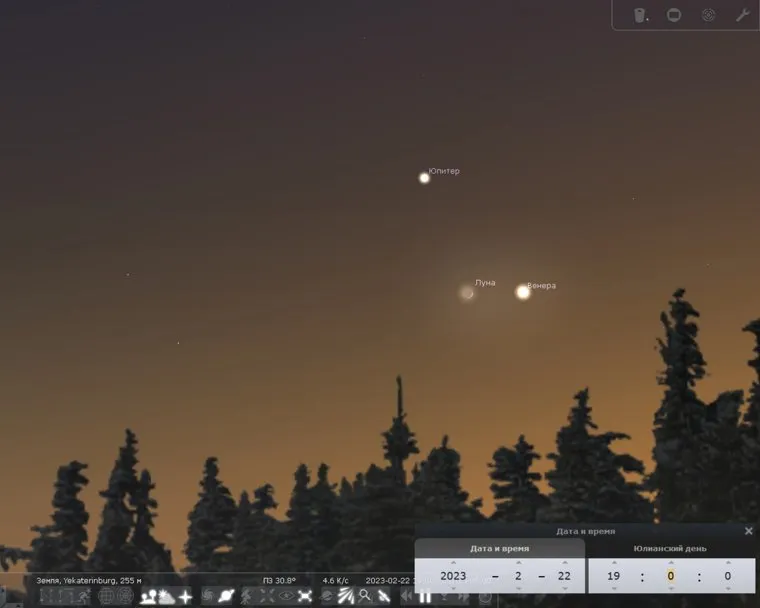 «Весь этот период Венера и Юпитер будут заметно сближаться друг с другом до второго марта, когда их будет разделять всего 0,5 градуса, это видимый диск Луны», — сказал Санакоев и пожелал уральцам ясной погоды и свободного времени.