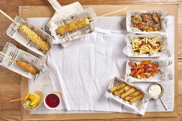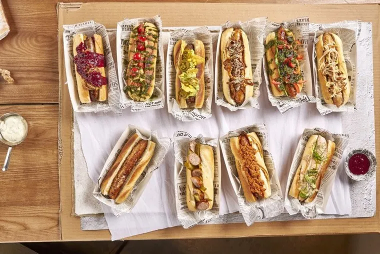 В меню есть 10 вариантов хот-догов: английский с ростбифом и брусничным взваром, китайский с курицей терияки и ростками сои, баварский с квашеной капустой, мексиканский с гуакамоле, начос и перчиком халапеньо, японский с крабовой колбаской, васаби и водорослями, итальянский с соусом болоньезе, греческий с фетой, маслинами и свежими овощами, французский с грибами, американский чиз-дог для любителей сыра и еврейский с хумусом и помидорами (считается вегетарианским). Помимо этого, гостям предложат батат с горгонзолой, картофель фри с соусом чили майо и мятый картофель терияки.