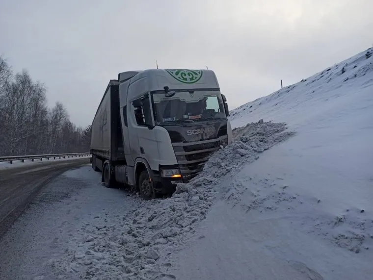 Водитель большегруза съехал с дороги и врезался в сугроб