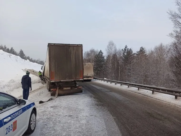 На челябинской трассе образовался затор из-за фуры, застрявшей в сугробе. Фото