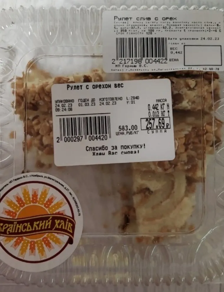 На приложенном фото видно, что рулет произведен местной пекарней «Украинский хлеб». Автор поста указал, что раньше у него к указанной пекарне не было никаких нареканий.