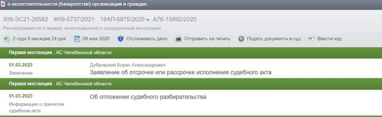 Согласно базе данных суда, заявление Дубровским подано 1 марта и пока не принято к производству. Долг у челябинского экс-губернатора перед ПО «Монтажник» возник, когда конкурсный управляющий Елена Соломка добилась признания незаконной сделки, согласно которой с декабря 2019 года по июнь 2020 со счетов «Монтажника» Дубровскому было перечислено свыше 37 млн рублей.