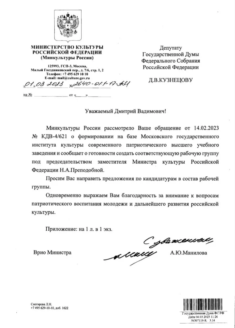 «Минкультуры России рассмотрело ваше обращение о формировании на базе Московского государственного института культуры современного патриотического высшего учебного заведения и сообщает о готовности создать соответствующую рабочую группу под председательством заместителя Министра культуры Российской Федерации Н.А.Преподобной. Просим вас направить предложения по кандидатурам в состав рабочей группы. Одновременно выражаем вам благодарность за внимание к вопросам патриотического воспитания молодежи и дальнейшего развития российской культуры», — говорится в документе.