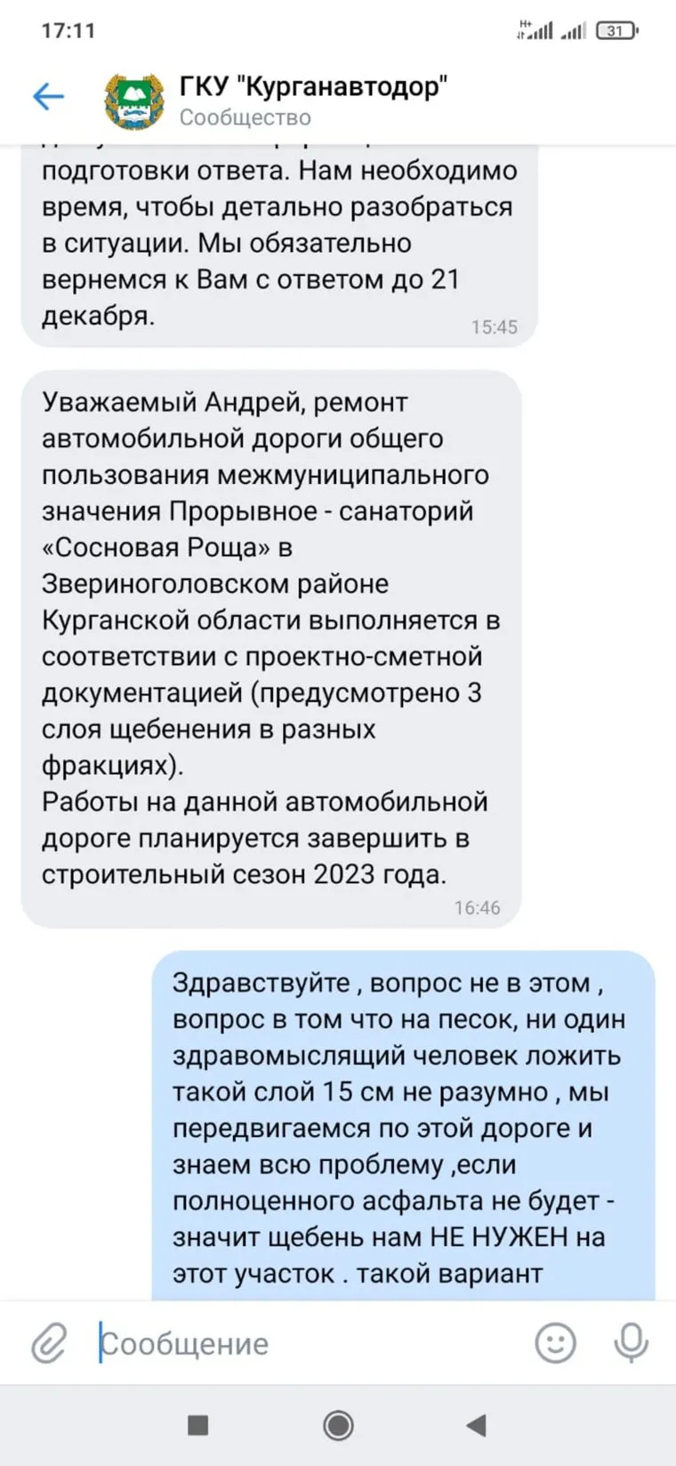 «Жителей села Прорывное не устраивает вариант ремонта дороги с. Прорывное — п. Искра и Прорывное — Сосновая роща в щебеночном варианте. Мы по этим дорогам ездим каждый день. Точно такую же дорогу нам „отремонтировали“ в деревне — глину и щебень положили в песок, дорогу испортили. Теперь ее нельзя грейдировать — по щебенке нож скачет, выбоины. Жители считают, что такой ремонт — это нерациональное использование бюджетных денег. В Куртамышском районе несколько дорог так же сделали, люди пишут, что стало только хуже», — рассказал Черепанов.