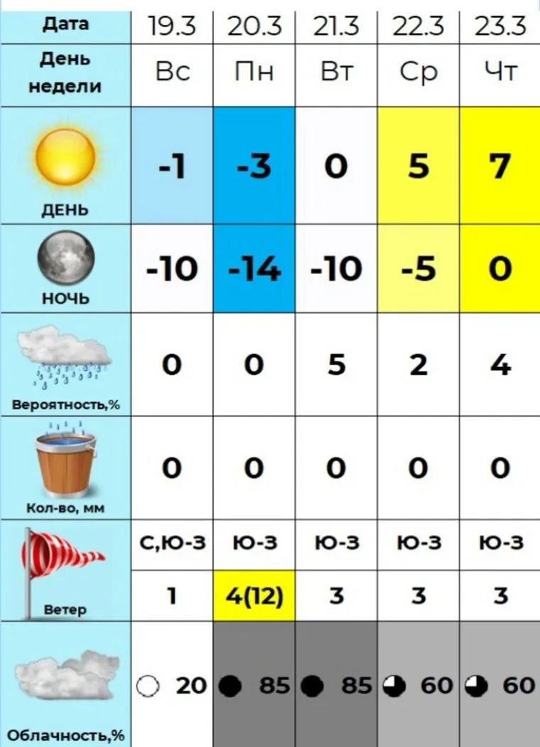 «20 марта в Кургане ожидается переменная облачность, без осадков. Порывы ветра до 12 м/сек. Днем от -3 до -5 градусов, ночью и утром от -13 градусов до -15. Температура воздуха днем 21 марта: 0 градусов. Ожидается преимущественно облачная погода. Вероятность осадков: 5%», — указано в опубликованных метеоданных на сайте «Погода 45».