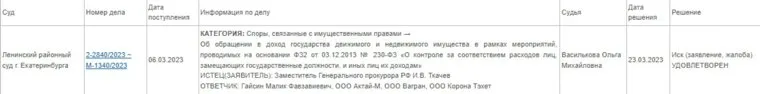 6 марта в Ленинский районный суд поступил иск от заместителя генерального прокурора РФ Игоря Ткачева. Ответчиками по делу выступают Малик Гайсин, а также еще три компании, среди руководителей которых, согласно сервису раскрытия информации СБИС, находится либо сам подозреваемый, либо его родственники — ООО «Актай-М» (96% акций владеет Гайсин Айдан Малик), ООО «Вагран» и ООО «Корона Тэхет» (генеральным директором обеих компаний выступает Малик Фавзавиевич Гайсин). Также в деле есть третьи лица — банк «Вятич» и завод электрических соединителей «Исеть».