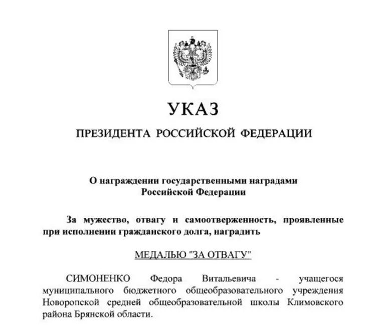 «За мужество, отвагу и самоотверженность, проявленные пари исполнении гражданского долга, наградить медалью „За отвагу“ Симоненко Федора Витальевича», — говорится на . Ранее мальчик был награжден медалью «Доблесть и отвага» от председателя СК РФ Александра Бастрыкина.