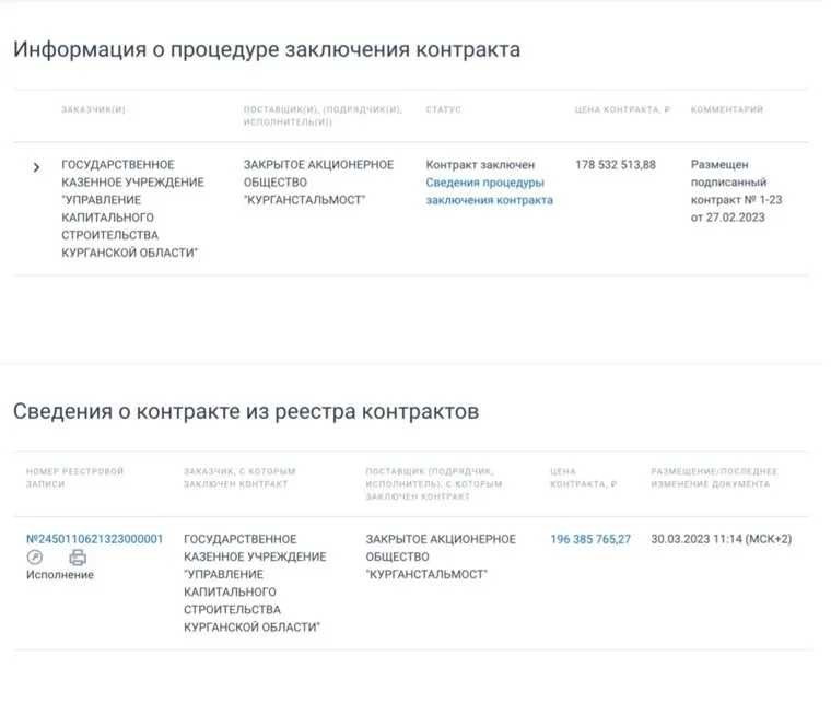«Информация о процедуре заключения контракта <…> на строительство ФОКа в Кургане. Подрядчик: „Курганстальмост“. Цена на 30 апреля 2023 года: 196 387 765,27 рубля», — указано в опубликованных документах.