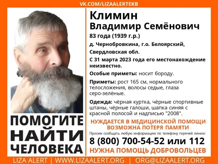 В деревне Чернобровкина (Белоярский городской округ, Свердловская область) 31 марта пропал 83-летний Владимир Климин. У мужчины проблемы с памятью, отметили волонтеры поискового отряда «ЛизаАлерт».