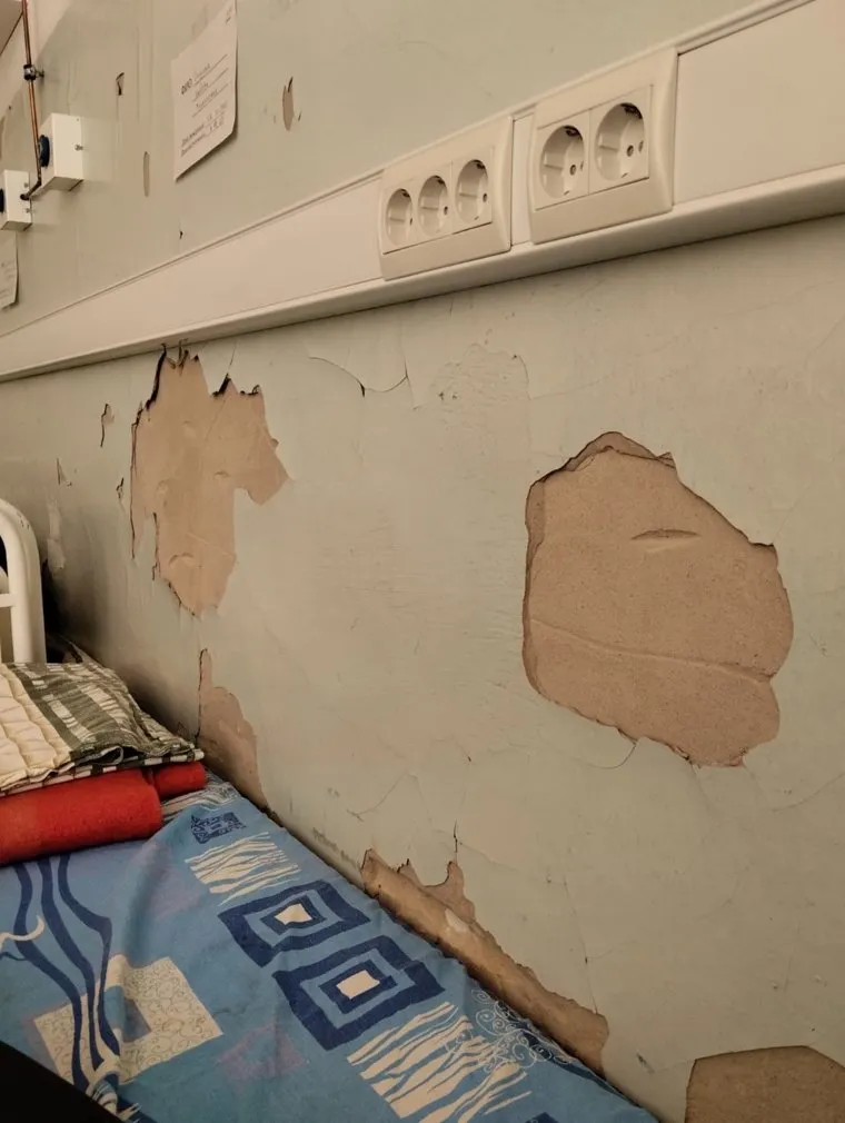 В Курганской областной больнице №2 (ранее горбольница №2) пациенты лежат в палатах с осыпающейся на кровати штукатуркой. Фото с видом больничных палат, требующих ремонта, размещены в курганском паблике соцсети «ВКонтакте».