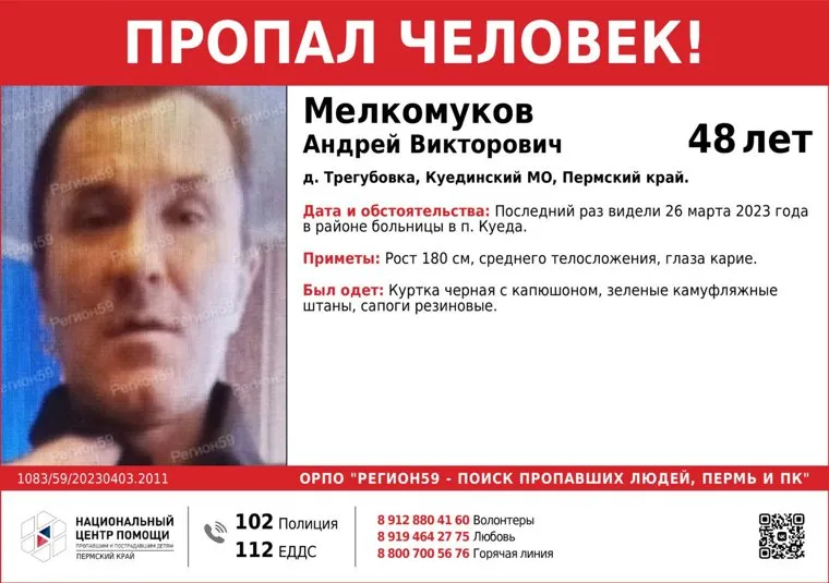 «Пропал 48-летний Мелкомуков Андрей Викторович, деревня Трегубовка, Пермский край. Последний раз его видели 26 марта 2023 года в районе больницы в поселке Куеда. С тех пор его местонахождение неизвестно», — указано в telegram-канале поискового отряда «Регион 59». На момент исчезновения мужчина был одет в черную куртку с капюшоном, камуфляжные штаны и резиновые сапоги.