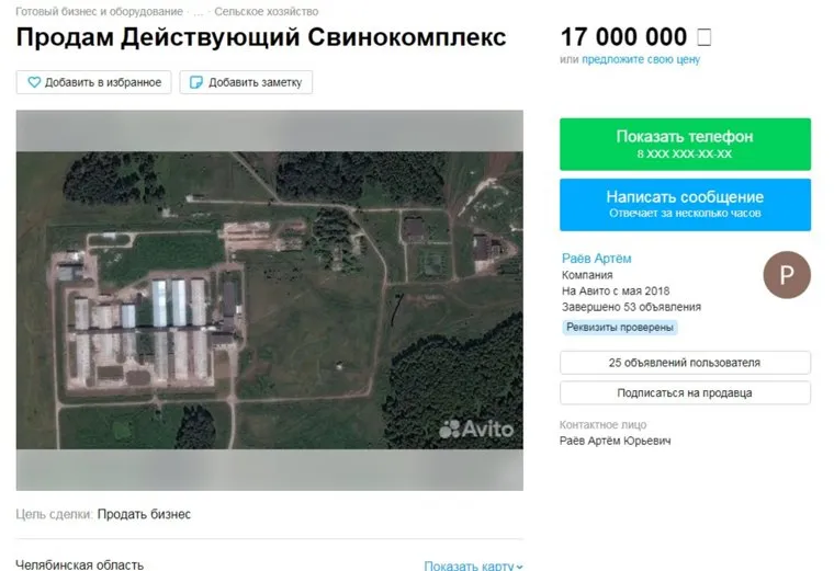 Крупный свинокомплекс выставлен на продажу в Челябинской области. Скрин