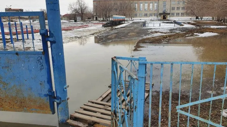 В Шадринске дети прыгают по поддонам, чтобы добраться в подтопленную школу. Фото