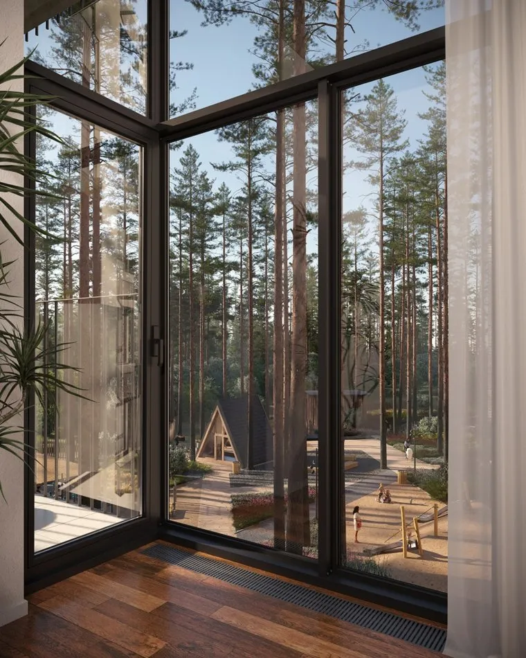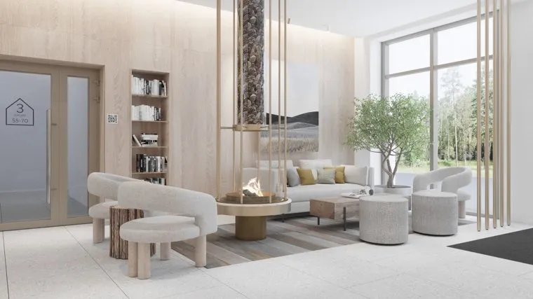Вместо привычных подъездов в жителей будут встречать просторные лобби. В их оформлении преобладают мягкие, естественные оттенки, внутри много света и теплой текстуры дерева. В каждом лобби будет биокамин и большая открытая терраса. Для любителей отдыха на свежем воздухе предусмотрены лаунж-зоны во дворах, а для детей — игровые площадки в эко-стилистике.