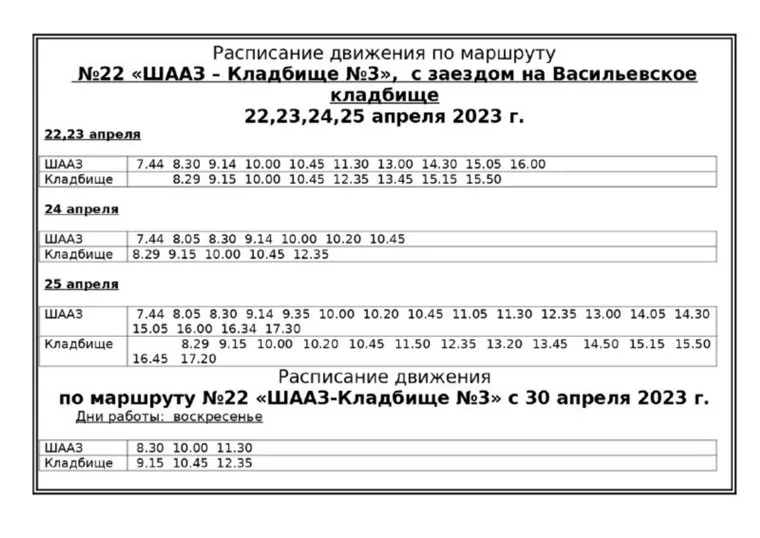 «С 22 по 25 апреля будут введены дополнительные автобусы до Андреевского кладбища № 3. Также планируется заезд к центральному входу Васильевского кладбища», — говорится в сообщении. Рейсы будут отправляться от остановки «ШААЗ».