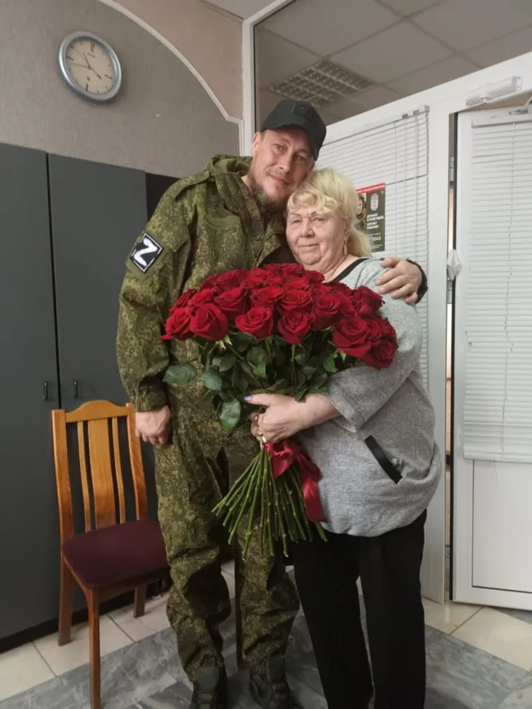 Сегодня к жительнице города Карталы Светлане Гаврилковой в гости прямиком с зоны СВО приехал карталинец Александр Внучков — с огромным букетом цветов