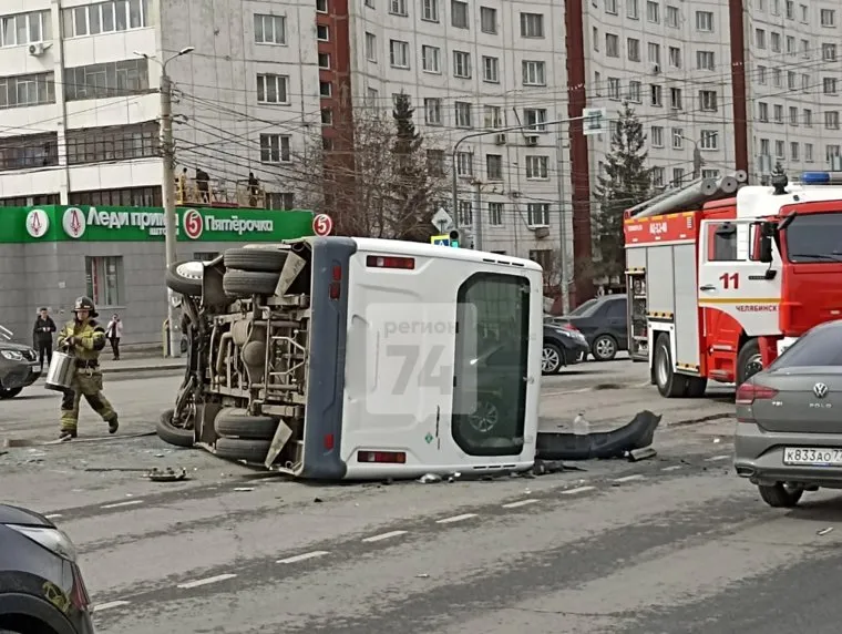 Маршрутка перевернулась на перекрестке в Челябинске. Фото, видео