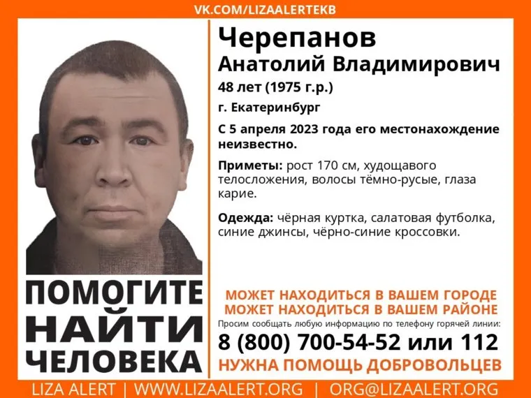 «Пропал Анатолий Черепанов. Ему 48 лет, он живет в Екатеринбурге», — пишут волонтеры в соцсети «ВКонтакте».