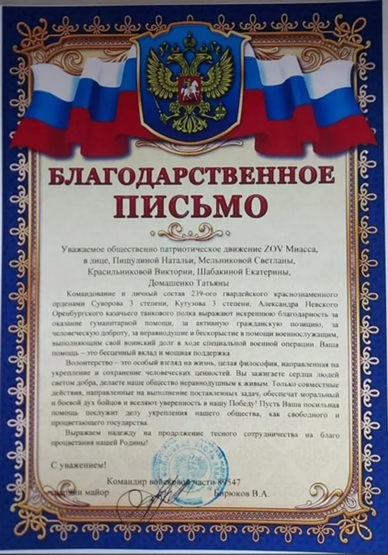 «Уважаемое общественно-патриотическое движение „ZOV Миасса“ в лице Пищулиной Натальи, Мельниковой Светланы, Красильниковой Виктории, Шабакиной Екатерины, Домашенко Татьяны, командование и личный состав 239-го гвардейского краснознаменного ордена Суворова 3 степени, Александра Невского Оренбургского казачьего танкового полка выражают искреннюю благодарность за оказание гуманитарной помощи, за активную гражданскую позицию, за человеческую доброту, за неравнодушие и бескорыстие в помощи военнослужащим, выполняющим свой долг в ходе специальной военной операции. Ваша помощь — это бесценный вклад и мощная поддержка», — сказано в благодарственном письме, которое получили миасские волонтеры.