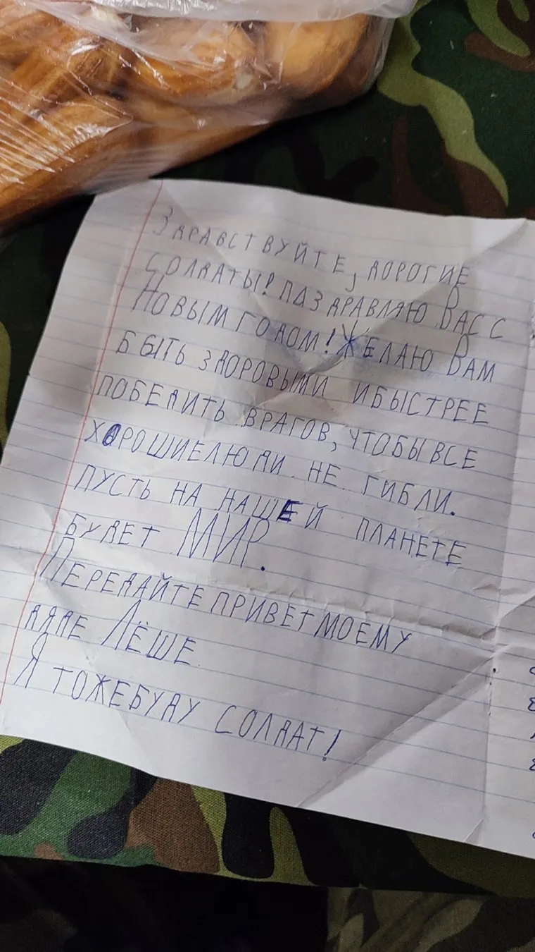 В письме на фронт ребенок написал поздравление с Новым годом и пожелания. Он попросил найти своего дядю Лешу и заявил, что тоже собирается стать солдатом. Боец ответил, что линия фронта очень большая, поэтому найти дядю Лешу ему не удалось.