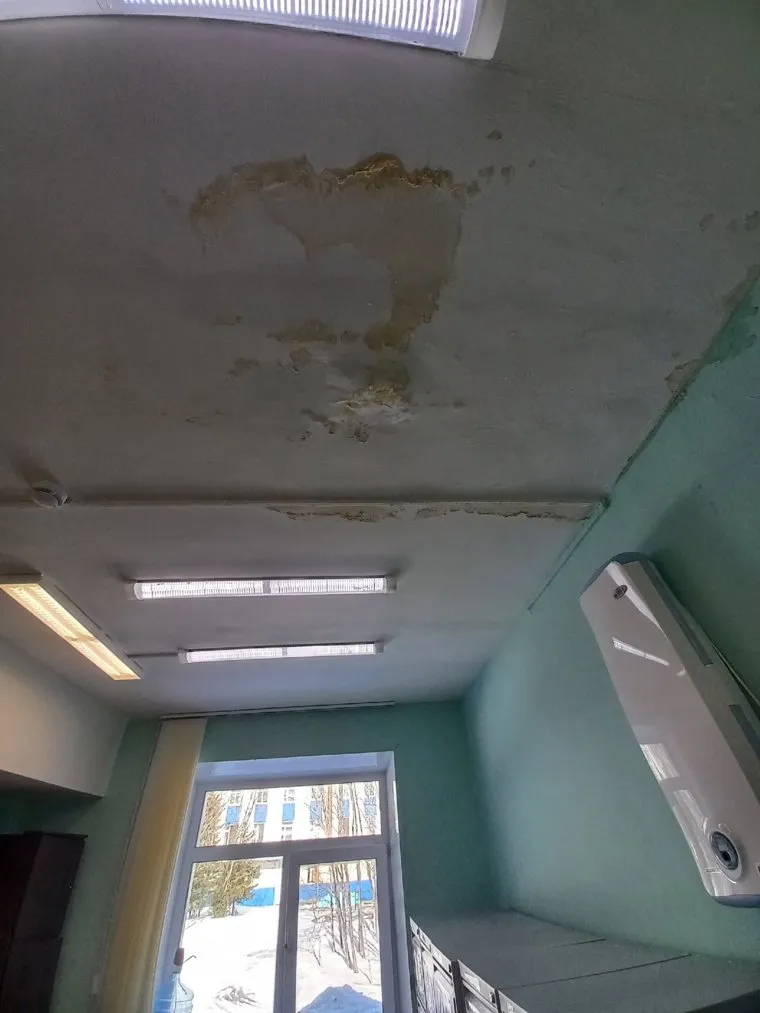 Жители Надыма (ЯНАО) пожаловались на условия городской больницы, в которых вынуждены работать медики. Как видно на фото, которые показала Мария Лоншакова в соцсети «ВКонтакте», в кабинете протекает потолок.