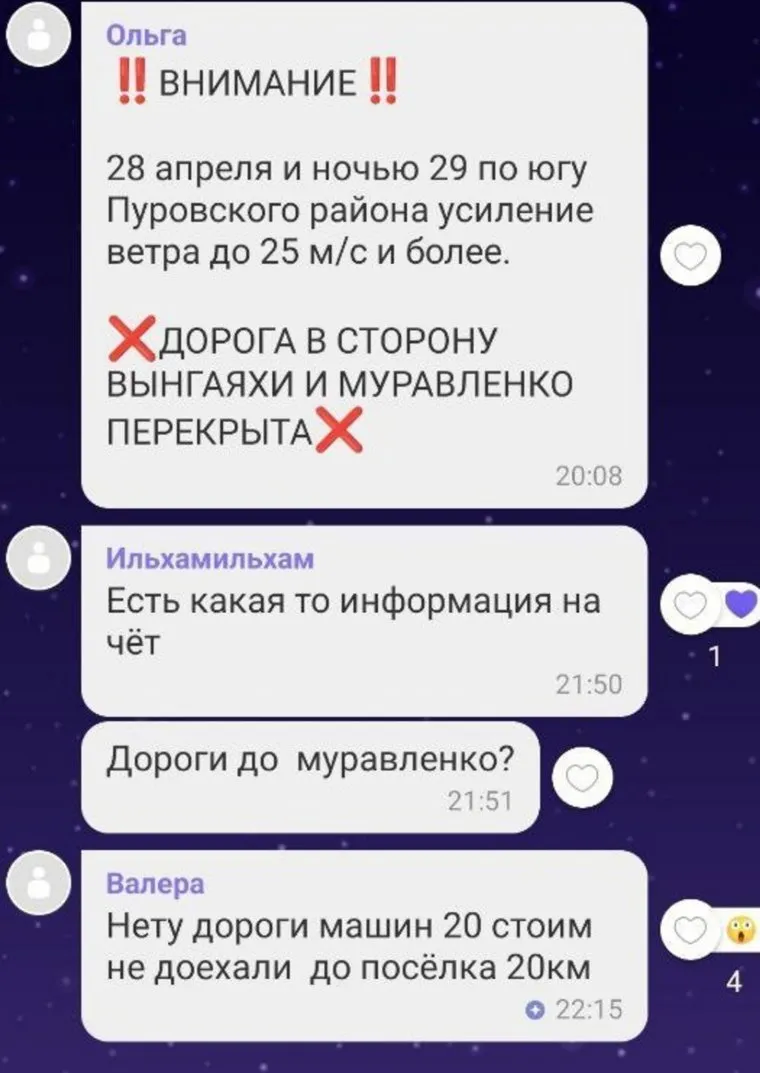 Ранее администрация поселка Ханымей разместила информацию об усилении ветра до 25 метров в секунду. В telegram-канале «Ханымей. Официально» также сообщили о закрытии выезда из поселка и дорог в сторону Муравленко и Вынгаяхи в связи с погодными условиями.