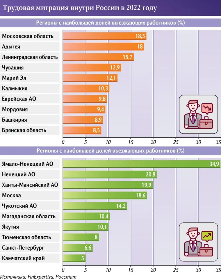 Эксперты отмечают, что традиционно трудовых мигрантов интересуют Москва, Санкт-Петербург, регионы, расположенные на Дальнем Востоке и на севере страны. Последние привлекают высокими зарплатами и вахтовым методом работы. Для исследования аналитики проанализировали данные Росстата. «Типичный портрет внутрироссийского трудового мигранта — специалист с высшим образованием или квалифицированный рабочий», — отметила президент FinExpertiza Елена Трубникова.