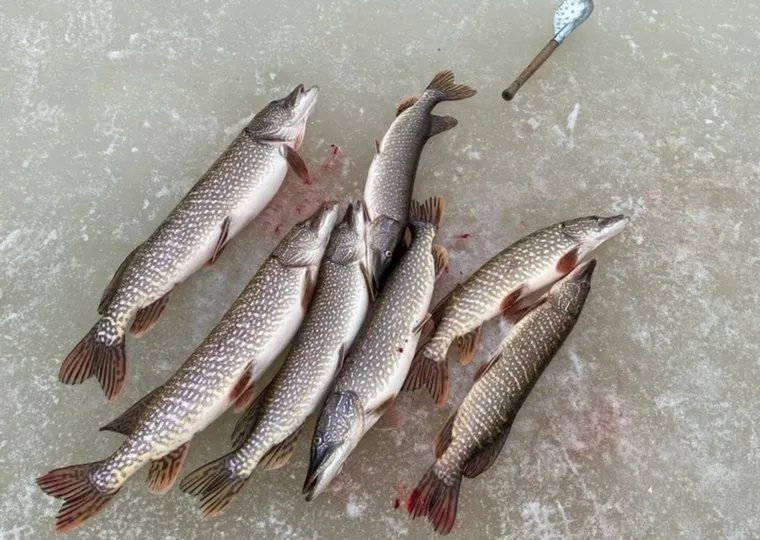 На фото видно, что снег со льда реки полностью сошел. Щербатов закрыл сезон, достав из лунок семь щук средних размеров.