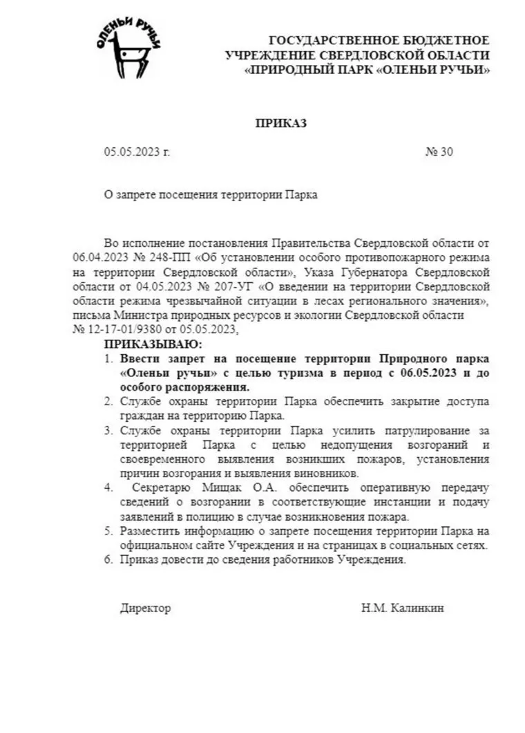 «Приказываю ввести запрет на посещение территории природного парка „Оленьи ручьи“ с целью туризма в период с 06.05.2023 и до особого распоряжения», — указано в документе. Также усилят патрулирование парка.