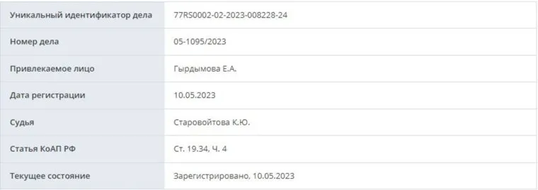 «Привлекаемое лицо Гырдымова Е.А. привлекается по статье „Нарушение порядка деятельности иностранного агента“ (часть 4 статьи 19.34 КоАП)», — указано в карточке. Дело поступило в суд 10 мая. Певице грозит административный штраф в размере от 30 до 50 тысяч рублей с конфискацией предмета административного правонарушения.