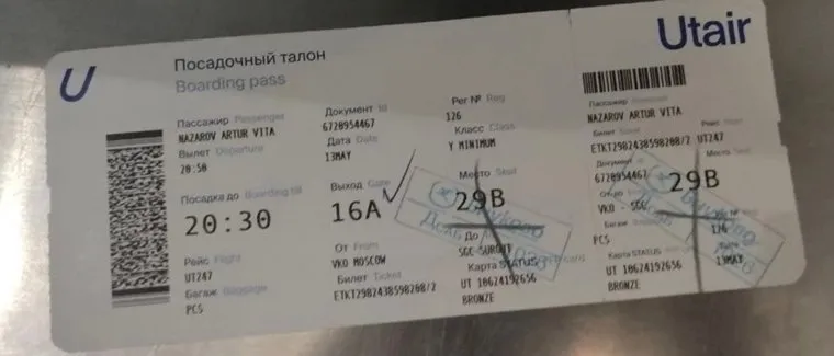 «Таможню я прошел в 20 часов 18 минут, был уверен, что успею. Подойдя к стойке я увидел, что около 10 человек стоят рядом и не проходят, хотя оставалось пять минут до окончания регистрации. Я обратился к девушке за соседней стойкой, она сказала, что сотрудник, проверяющий посадочные талоны ушел», — сообщил Артур Назаров корреспондент.