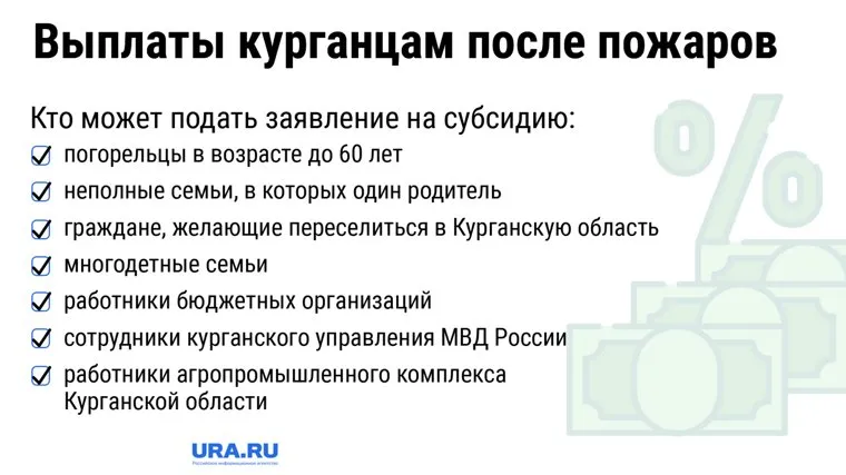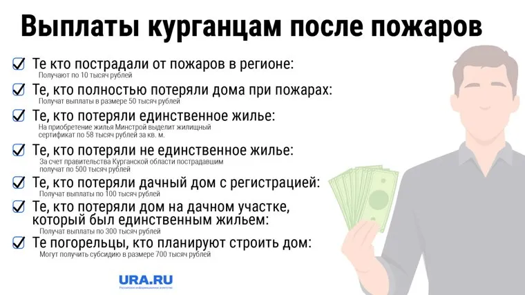 Губернатор Курганской области Вадим Шумков заявил, что более 2,5 тысяч пострадавших от масштабных пожаров в регионе уже получили обещанные выплаты. URA.RU собрали подборку в виде карточек со всей информацией о том, кто и как может получить выплаты от правительства.