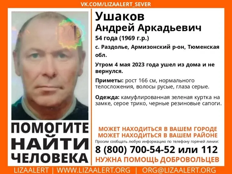 «Ушаков Андрей Аркадьевич, 54 года, село Раздолье, Армизонский район, Тюменская область. Утром 4 мая 2023 года ушел из дома и не вернулся», — указано в ориентировке.