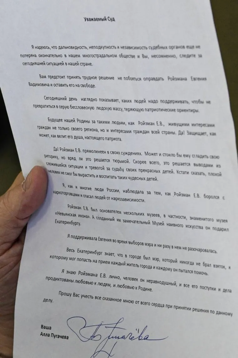 12:36 Суд сообщил, что обращение Пугачевой не является процессуальным документом, и не стал изучать его. Письмо вернули Ройзману.