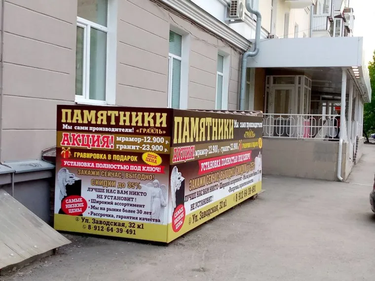 Как видно на фото, рекламные баннеры пестрят всевозможными слоганами. «Акция! Шок-цена! Гравировка в подарок! Самые низкие цены! Установка полностью под ключ! Закажи сейчас, выгодно! Лучше нас вам никто не установит!» — обещают клиентам мастера.