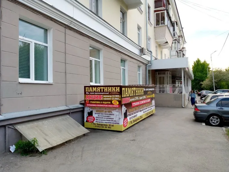 «Крыльцо я закрыл баннером, а в самом цокольном помещении на витринах стоят образцы памятников и приемщик принимает заказы. Производство у нас в другом месте, мы не шумим, никому не мешаем. Я наблюдаю, как родители приезжают, заходят в больницу с детьми и потом спокойно уезжают. На нас никто не обращает внимания», — уверил владелец.