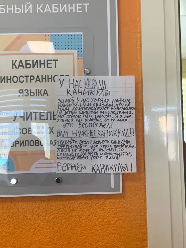 «Это беспредел! Зимой у нас убрали неделю каникул и сказали, что компенсируют, и мы выйдем на летние каникулы раньше, 17 мая. Но сейчас говорят, что учимся как обычно, до 26-го. Требуйте вернуть каникулы, прогуливайте уроки, срывайте все мероприятия!» — такой призыв появился на одном из кабинетов в школе №30.