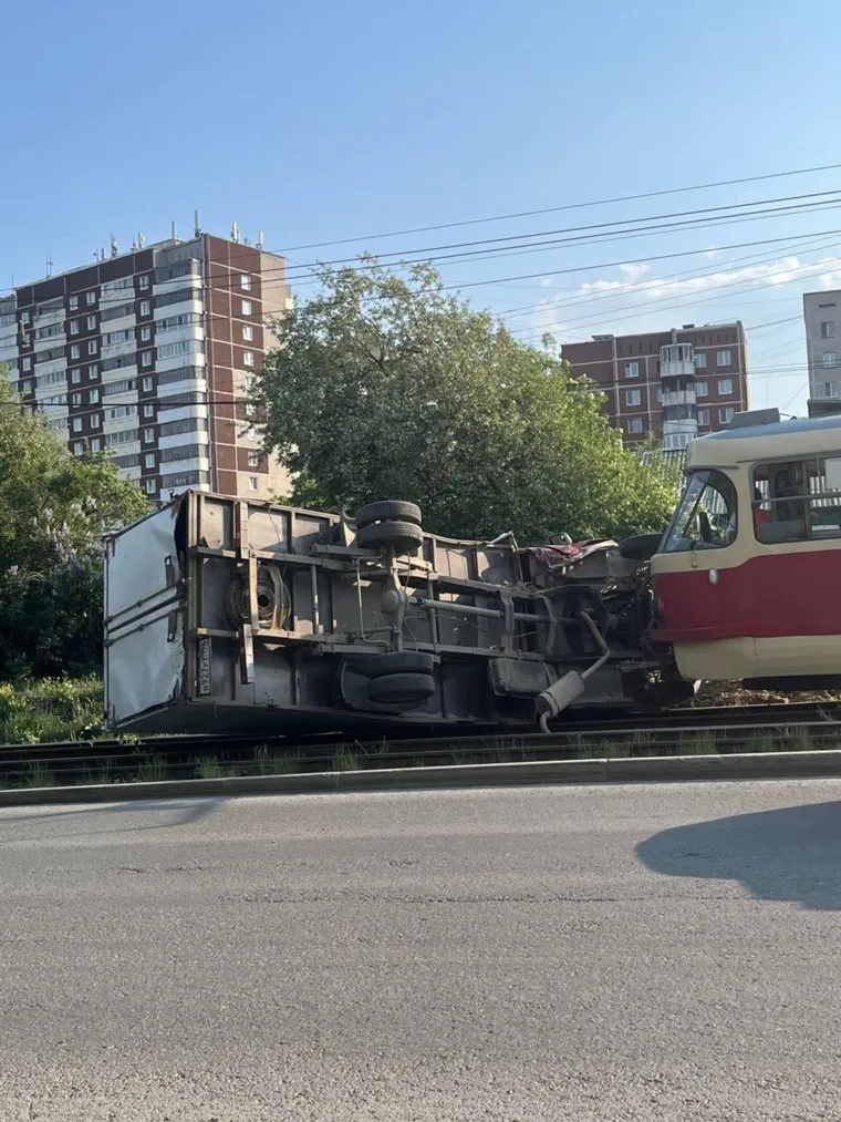 В районе Сортировки в Екатеринбурге трамвай столкнулся с «Газелью». Судя по видео, грузовая машина от удара перевернулась.