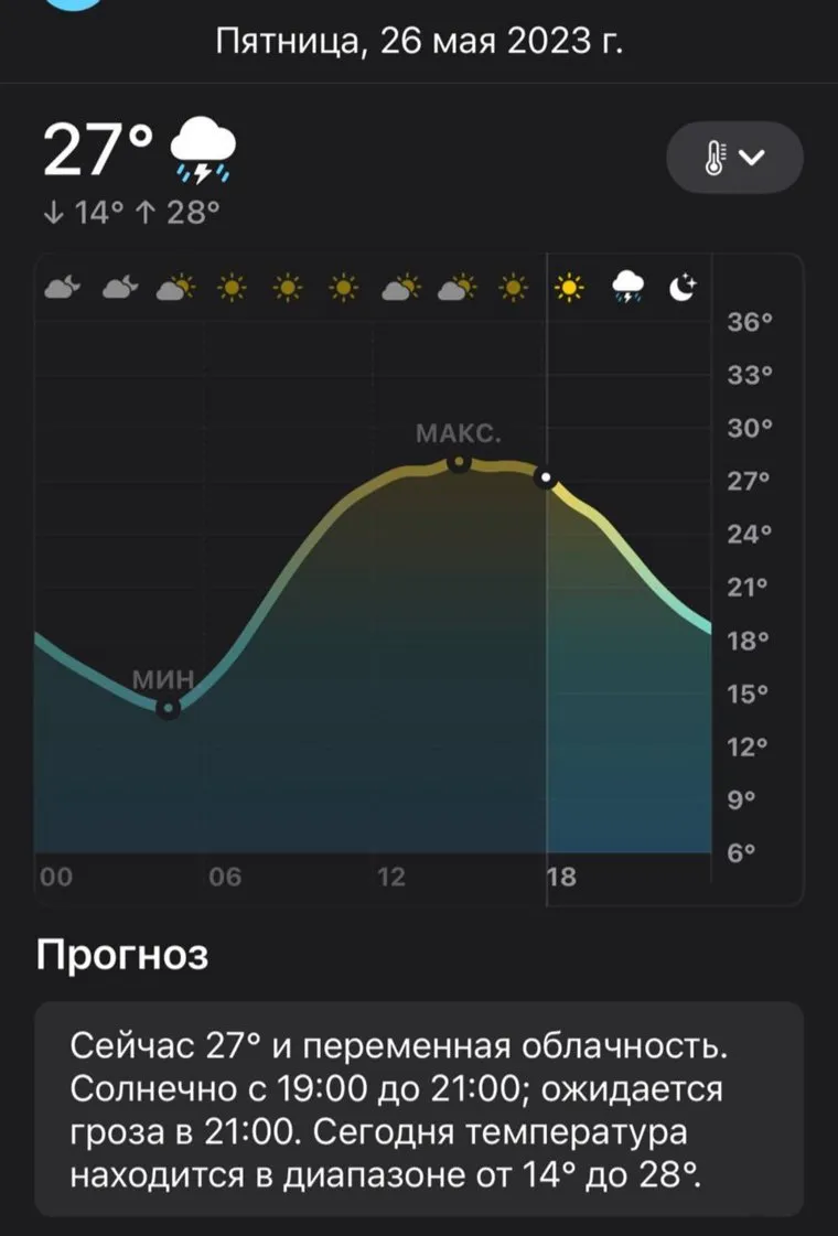 Вечером 26 мая, по данным метеослужбы Weather Channel, которая предоставляет прогноз погоды пользователям Apple, в Екатеринбурге пройдет гроза. Ранее URA.RU сообщало , что май в Свердловской области аномально жаркий с превышением среднесуточной температуры воздуха выше климатической нормы на семь градусов и более. В связи с этим в воздухе повышено содержание вредных примесей.