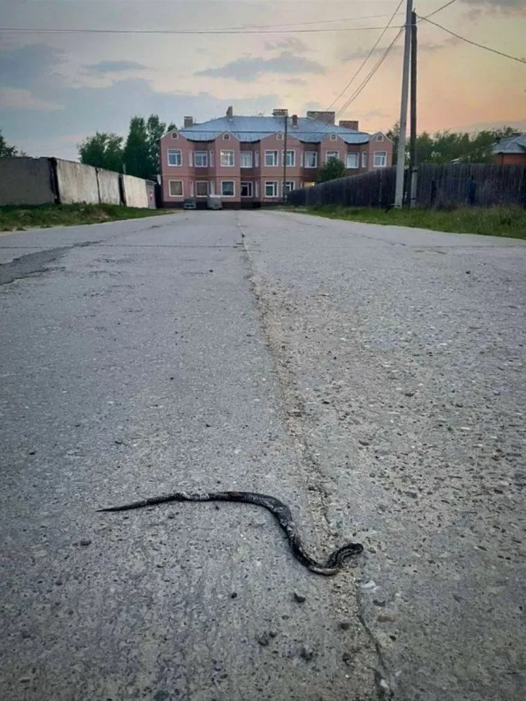 «Жители Югорска-2 заметили на территории района змею», — пост с фото опубликован в telegram-канале «Наш Югорск». На фото видно, что на асфальте лежит змея.