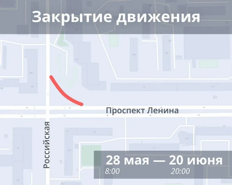 «В связи с проведением работ на сетях водоснабжения с 28 мая до 20 июня будет закрыт правый отнесенный поворот с проспекта Ленина на улицу Российскую. Водителей просят учитывать временные знаки дорожного движения», — уточнили в мэрии.