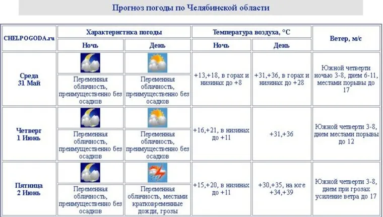 По ночам в низинах будет прохладно — до 11 градусов. На большей части территории Южного Урала и в темное время суток будет очень тепло для мая — до 21 градуса. В области и собственно Челябинске днем 2 июня возможен дождь. Однако аналогичный прогноз на сегодняшний день, который синоптики дали накануне, не оправдался: ни в ночь, ни до середины дня 30 мая обещанной грозы и ливней не случилось.