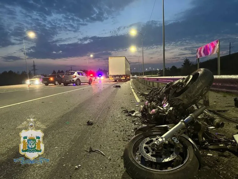 После столкновения с легковушкой мотоцикл отлетел в КАМАЗ