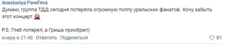 Однако есть и те, кто остался крайне недоволен всем произошедшим. «Думаю, группа „Три дня дождя“ сегодня потеряла огромную толпу уральских фанатов. Хочу забыть этот концерт», — пишет девушка. Другие называют выступление жутким, позорным и отвратительным.